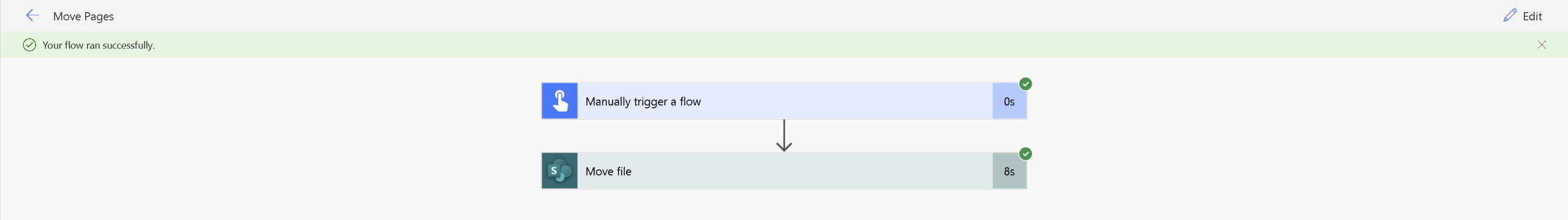 6. That is the workflow now built and ready to use. This ended up being the quickest and easiest way to move pages and the client found that just selecting the page in the move file action was most effective. Here is what the flow looked like.