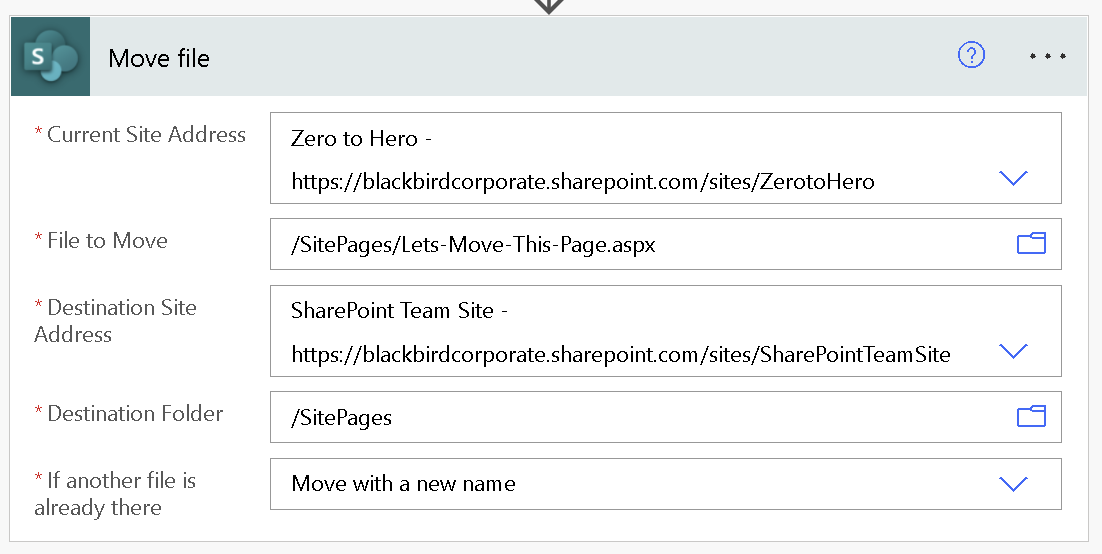 3. We can now configure the first action which will be a SharePoint “Move File” action. You can pick the site and the page you wish to now move. First set the current site address and then click on the file to move folder icon.