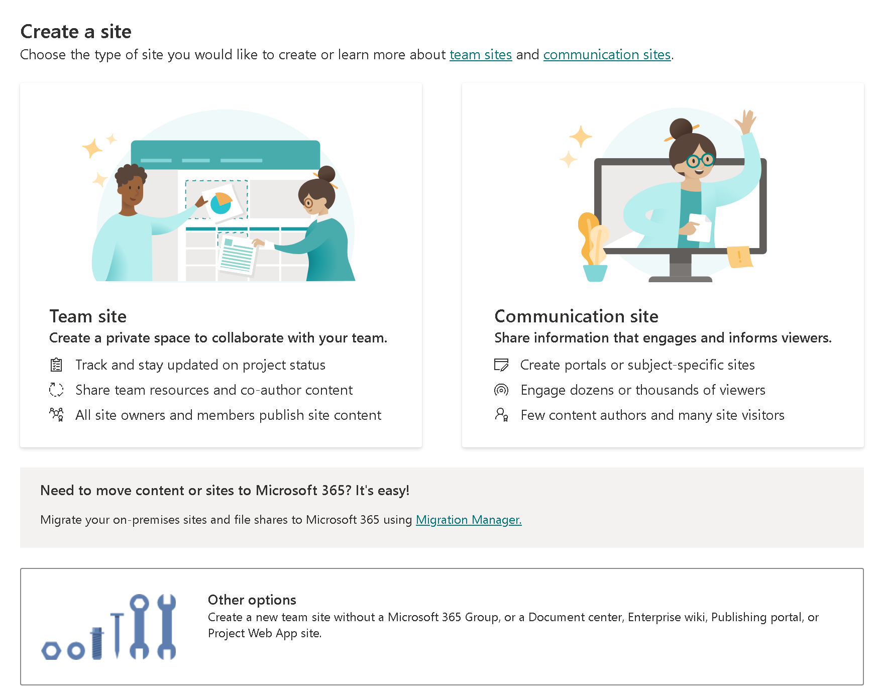When creating SharePoint Sites there are 3 basic options available and we want to ensure you are using the correct one.